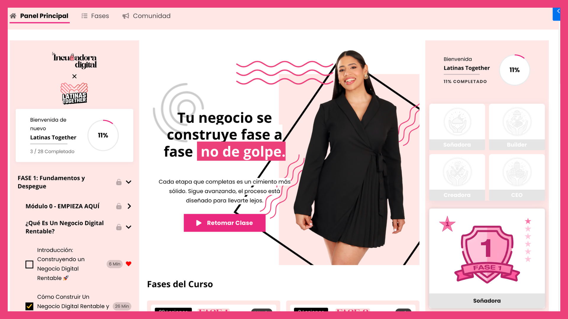 Es un sistema completo donde cada mes desbloqueas la siguiente fase de tu negocio, con contenido, sesiones en vivo y acompañamiento real hasta que tienes un negocio digital funcionando de verdad.